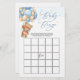 This design features a friendly Teddy Bear with blue and cream balloons. Text "Baby Bingo" is written in modern calligraphy font .