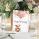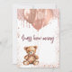 A Guess how many card for a Baby Shower. A white background. Decorated with rose gold balloons, a cute teddy bear and faux sparkles.