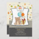 An adorable invitation featuring a stuffed teddy bear holding balloons. The unique background is layered with colorful polka dots, stripes and has a decorative panel with the words "baby shower".