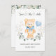 This design features a friendly Teddy Bear with blue bow and heart balloon. He is surrounded by greenery foliage. Texts Save the Date is written in calligraphy style. On the top of the card - gold effect confetti.
