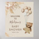 Bohemian Bear baby shower welcome poster featuring a light brown background, a vintage watercolor baby bear, balloons, rustic boho pampas grass & florals, plus a modern text template that is easy to personalize.