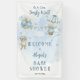 Cute Baby Shower "Welcome" design featuring a teddy bear with a blue bow-tie hanging on to a bunch of balloons on one side with an air balloon carrying a floral bouquet on the right side. Bunting flags hang between the two balloons. Clouds and stars on a blue watercolor background round out the design. Composite design by Holiday Hearts Designs.