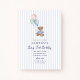 Adorable teddy bear first birthday invitation featuring a sweet watercolor bear holding pastel balloons against soft blue vertical stripes. This “Beary First Birthday” invitation is perfect for a baby boy’s first birthday party with a gentle, storybook feel. The classic blue palette and charming teddy bear illustration make it ideal for teddy bear themes, vintage baby celebrations, and soft nursery-inspired birthday parties. A lovely choice for parents planning a sweet and timeless blue first birthday celebration.