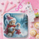 A brown teddy bear in a hat, earmuffs, and red scarf builds a small snowman in a winter woods