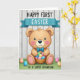 Designed with a sweet spring scene, this card features a plump teddy bear with tawny fur, bright blue eyes, and rosy cheeks, gazing forward with an inviting, friendly look 🐰. A small blue bow tie sits neatly at its neck, giving the character a dressed-up, affectionate feel. The bear holds a woven basket brimming with decorated eggs in blue, pink, green, and yellow, and a few more eggs rest near its paws as if shared between close friends. The setting places the bear on a fresh green lawn in front of weathered white wooden planks, creating a cozy, rustic backdrop. Near the top, a teal banner stretches across with a joyful message in white lettering, and it’s framed by darker text that calls out a special milestone. Soft shading and gentle highlights round out the bear’s shape so it looks slightly three-dimensional, and the pastel palette keeps everything light and springlike 🌷. The teal banner sits above the bear’s head, with the white lettering centered on it and the darker text positioned nearby for contrast. Around the bear’s feet, the patterned eggs are spaced across the grass in small clusters, with colors alternating from cool blues to warm pinks and sunny yellows.