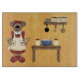 Whimsical Teddy Bear dressed in a red dress with a ruffled white collar, matching headband and a white apron with hearts on the pockets. She stands next to her baking table, with a bowl and some canisters of ingredients. A shelf hanging on the wall has canisters on it as well and various utensils hanging from the shelf. Background is a wood grain look.