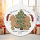 Cute, vintage, teddy bear Christmas tree trimming on white background. Teddy bears wearing Santa Claus red hats trimming a traditional Christmas tree. Grandma, Grandpa, Merry Christmas and year templates on both sides created for you.