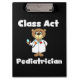 A cute pediatrician design clipboard any pediatrician is sure to love, features a teddy bear doctor with lab coat and stethoscope and white text that reads Class Act Pediatrician on a black background.