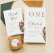 A cute and minimal design, with "one" in classic serif capitals printed at the top of the card. Below, the birthday boy's name is in green script lettering. The party details are aligned to the left, with a hand-painted watercolor teddy bear wearing a party hat, green overalls, and holding a little flag on the right. Cards reverse to a cute star pattern against a warm brown background. Ideal for teddy bear picnic, beary first birthday, and woodland themes. As part of Zazzle's budget selection, this sheet doesn't come in standard card sizes. To get this design on a standard card, you can find it in the collection or use the Zazzle Make Machine to transfer it onto your preferred product. View the collection linked on this page for matching items or visit our store for more first birthday party invitations.