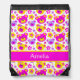 Cute bright teddy bear faces and graphic flowers art patterned kids pink, white and yellow drawstring bag. Ideal for trips out sleep overs or to take to school. Personalize with your own name, currently reads Amelia. Original graphic teddy art design by Sarah Trett.