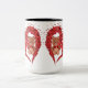 A white ceramic mug featuring a design of a heart shape composed of smaller red hearts, with a cute brown teddy bear holding a small red heart inside the main heart. The mug has a black rim and handle