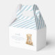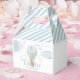 Cute light blue teddy bear flying on hot air balloon in theme adventure begins baby shower thank you favor box.