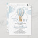 Cute blue teddy bear on hot air balloon baby boy shower invitation postcard. Adventure awaits theme baby shower invite.