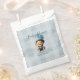 Create unique baby shower favor bags featuring blue colors, and a casual chic teddy bear with gingham and balloons. The front includes the event name and guest of honor that you can edit for your needs. Bear Jean Baby design. Use the template to create a special, personalized favor bags for your baby shower.