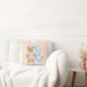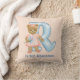 Cute nursery pillow or child's room pillow has soft pastel peach background that you can change to another color if you click the customize button and then look on the right for the small edit link. Front of pillow features a girl teddy bear with a hair bow and bouquet of flowers next to a pastel aqua blue heart pattern letter R with text saying R is for Rhiannon. Text area is ready for you to change to your child's name.