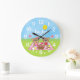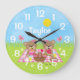 Cute bears having a picnic on a pink gingham cloth with treats such as honey, watermelon, strawberry jam, apples, lemonade and pie. In the background is a bright blue sky and sunshine, butterflies and daisies.