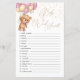 This design features a friendly Teddy Bear with pink and cream balloons. Text "Baby Word Scramble" is written in modern calligraphy font. Unscramble the baby words. The Answer Key: Baby Powder, Bottle, Blanket, Diapers, Lullaby, Car Seat, Thermometer, Shampoo, Pacifier, Rattle, Bassinet, High Chair, Baby Monitor, Stroller, Nursery, Rocking Chair