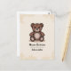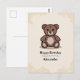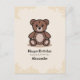 A birthday postcard with an illustration of a teddy bear against a stained background and customizable texts with a curvy line: perfect to send to a kid or to accompany a gift!