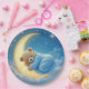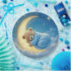 A cute teddy bear is cozily wrapped in a blue blanket, resting peacefully on a glowing crescent moon in a dreamy night sky.