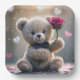 A fluffy teddy bear with a formal black bow tie holds a single long-stem red rose surrounded by softly glowing heart shapes.