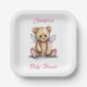 Pretty baby shower paper plates, with graphics of a sweet teddy bear with pink and blue wing, in the middle. Personalize the pink text to suit your needs. Matching invitations, paper cups and napkins are available.