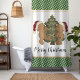 Cute teddy bears wearing red, Santa Claus hats decorate their Christmas Holiday tree on white and gold bordered back with green and white check pattern background.