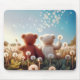 Two teddy bears sit in a field of dandelions, watching the seeds float away into the sky