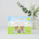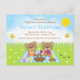 This cute and whimsical birthday invitation features adorable bears having a picnic on a blue gingham cloth with treats such as honey, watermelon, strawberry jam, lemonade and pie. In the background is a bright blue sky and sunshine, butterflies and daisies. The text combines decorative and serif fonts for a stylish and modern look. This is perfect for a spring or summer birthday party.