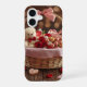 This phone case art shows a teddy bear, roses, and chocolates together.