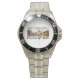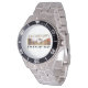 Has heft and feel of expensive stainless steel quartz watches. Good band with safety catch. I removed links, which is easy because engraved arrows show direction to push the linking pins. As always by this seller, the image (a railroad logo) is a perfect reproduction of my emailed image, and is precisely spaced and aligned.