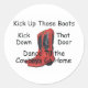 Kick Up Those Boots, Kick Down That Door, Dance Til the Cowboys Go Home. Get the slogan for every guy or girl who wore some country boots, listened to country music, had a drink in a country bar, or danced a line dance. For all those cowgirls and cowboys out there.