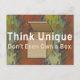Think Unique Don't Even Own a Box catch phrase and graphic on t-shirts & gifts for all those at work, students, inventors, and creative minds in every endeavor.