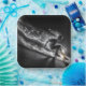 A teenage skateboarder rides down a steep incline trailing a luminous, sparkling aura behind him on black.