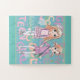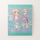 Illustration of a jigsaw puzzle featuring two Caucasian girls, standing side by side. The girl on the left has long, straight blonde hair with a white flower accessory, wearing a pink floral dress with a ruffled skirt, white tights, and pink sneakers. The girl on the right has light brown hair styled in pigtails, wearing a purple dress with a matching shoulder bag, white knee-high socks, and white sneakers. The background is a teal color with horizontal stripes and pastel-colored words and shapes. The illustration style is cartoonish with clean lines and bright colors.
