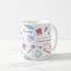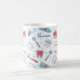A mug with a dental themed pattern. Featuring colorful illustrations of teeth, toothbrushes, and various dental tools.