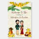 Telugu Tamil South Indian wedding welcome sign with banana leaves, kalash and lamps and cute traditional clothes bridal couple.