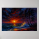 A blaze of sunset ruptures the storm—golden light colliding with wind-torn palms and crashing surf. In this moment of elemental tension, nature is both violent and sublime. The swirling clouds, rendered in bruised reds and purples, echo the emotional turbulence beneath the surface. Waves rise like breath held too long, and the beach glows with the last embers of day. This piece invites viewers to stand in the eye of beauty and chaos, where endings burn brightest.