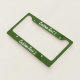 You can edit the text at the top and bottom of this forest green license plate frame. The text is a white script. All text can be edited or deleted.