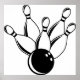 Simple black and white illustration of ten pin bowling skittles being knocked down by a bowling ball. Easily customize and choose your own background colour. Image available on various gifts and products.