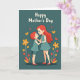 Designed with a calm teal background, this card features two figures centered close together, a taller person with reddish-orange hair and a smaller companion with matching bright hair. Their hands are gently clasped, and they lean in with soft smiles and rosy cheeks, sharing a tender look that reads like quiet affection ❤️. Both wear coordinated aqua outfits, with a dotted dress on the taller figure and a tunic-and-shorts set on the smaller one decorated with small star shapes. From the lower edge, yellow and orange flowers rise with deep red leaves, framing the pair like a garden border 🌼. A few butterflies in similar warm tones flutter around them, adding a light sense of motion. Near the top, the words “Happy Mother’s Day” appear in creamy white lettering, centered above the figures. The artwork has a layered, cut-paper look with gentle shadows, and the blossoms and butterflies are arranged mostly along the bottom and sides while the text sits high and clear.