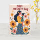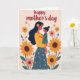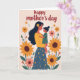This card shows a gentle embrace between a woman and a small child, set on a soft cream background that feels calm and close. Their faces tilt toward each other, eyes meeting with a tender, affectionate look that suggests deep trust and closeness ❤️. The woman has long dark hair with a bright yellow flower tucked near her ear, and she wears a warm yellow top with a deep blue skirt covered in small floral patterns. The child is held securely, with little hands resting against her chest, adding to the sense of protection and warmth. Around them, a garden of large yellow sunflower-like blooms with brown centers mixes with smaller pink and orange flowers, creating a cozy, celebratory scene 🌼. The colors balance sunny yellows, soft coral tones, deep greens, and muted creams, with fine linework and light texture throughout. Above the figures, a hand-lettered greeting sits near the top in a darker contrasting color, spaced to frame the pair without crowding them. The flowers cluster along the sides and lower area, with tall stems and rounded petals repeating in a neat, decorative rhythm.