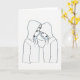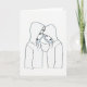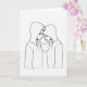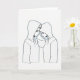 This card shows two young women in profile, standing close in hooded sweatshirts as their shoulders and sleeves gently overlap in the center. A thin, pale blue outline traces around both figures like a soft glow, separating them from the wide white background and making their closeness feel private and tender 🥰. The woman on the left tilts her face toward the other with a calm, caring look, and her hand rests lightly on her partner’s arm as if offering quiet reassurance. The woman on the right lowers her eyes with a shy, inward posture, leaning into the shared space as though she’s letting herself be comforted ❤️. The drawing stays mostly black linework with lots of open white space, keeping attention on their faces and the small touch between them. A short message appears near the top in a small, light-colored font, leaving plenty of breathing room above the figures. The most striking detail is the rich red color on the right figure’s lips, standing out sharply against the otherwise simple palette.