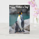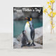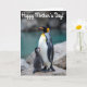 On the front of the card a striking nature photo captures a tall adult seabird standing on rugged rocks beside its fluffy young, their bodies angled close like a gentle embrace ❤️. The adult’s feathers show crisp black and bright white, with warm golden-orange coloring around the head and upper chest, giving it a calm, protective look. Tucked against the adult’s belly, the small chick is a soft charcoal gray puff, tilting its head up with its beak slightly open as if asking for comfort. The pair sits centered in the frame, drawing your eye to the tender closeness between them, like a quiet moment of family affection. Behind them, the background falls into a smooth blur where turquoise water meets muted rocky shapes, keeping the focus on their connection. Natural light is soft and diffused, bringing out the sleek feather texture on the adult, the fuzzy down on the chick, and the rough grain of the stone perch 🌼. The message “Happy Mother’s Day!” appears near the top in a light-colored font that stands out against the darker tones of the photo. The water in the distance is a calm turquoise wash with indistinct shoreline rocks fading into the background.