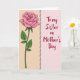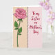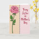 This card is split into two tall panels that sit side by side, creating a quiet, intimate balance like two friends leaning close ❤️. On the left panel, a single large flower opens in soft pink, with a thin dark outline that gives it a gentle graphic look against a creamy beige background. The bloom rests on a slim green stem with a few broad leaves, and the calm spacing around it makes the flower feel like a thoughtful offering. On the right panel, a blush pink background holds a short Mother’s Day message in a flowing, cursive-style font, colored in a deep red that stands out warmly 🌼. The text is centered with comfortable margins, so it reads clearly without crowding the design. Between the panels, the dividing edge looks slightly torn and uneven, like a shared note passed between loved ones. The overall palette stays softly muted, with even lighting that keeps the colors gentle and the mood tender. The right side shows the red lettering on blush pink, while the left side shows the pink flower on beige with green leaves and a narrow dark outline.
