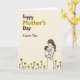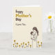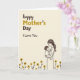 This card features a soft, cream-toned background with a stylized adult caregiver gently cradling a small child in the lower right, their faces angled toward each other in a tender, close gaze that suggests deep affection ❤️. The caregiver’s head tilts down in a smooth curve, while the child looks up, nestled securely against the adult’s chest, creating a quiet, intimate connection. Fine, flowing linework keeps the figures simple and calm, and the caregiver’s clothing includes small dotted accents that add texture without crowding the scene. In the upper left, a large dedication is placed prominently, with the first part in deep brown and a second accent in a goldenrod shade. The lettering sits open against the light background, balancing the figures on the opposite side. Along the bottom edge, a row of stylized flowers adds warmth and a gentle, friendly touch 🌼. The flowers have golden petals with darker centers, forming a neat border that grounds the illustration.