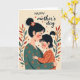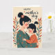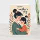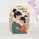 This card shows two simplified figures holding each other in a gentle embrace, set against a softly lit neutral background that keeps the focus on their closeness ❤️. The taller, motherly figure tilts her head down with eyes closed, while the smaller figure nestles in with the same calm expression, creating a tender, affectionate moment. At the top, a flowing, calligraphy-style greeting appears in a dark tone, centered above the illustration. The larger figure wears a muted teal-green outfit decorated with burnt-orange flower shapes, and the smaller figure’s earthy orange clothing echoes the same floral pattern for a matched look. Around them, thin branches curve along the sides with stylized leaves in russet and deep green, adding a quiet garden feel 🌼. Small scattered blossoms repeat the clothing motifs, tying the scene together without crowding it. A soft blush warms both faces, and the background stays minimal with gentle shading behind the pair and leafy sprigs framing the edges.