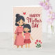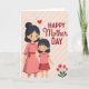Designed with two rounded, rosy-cheeked figures at the center, the illustration shows a taller adult woman and a younger girl standing close with an affectionate, celebratory feel ❤️. The adult wears a flowing coral-pink dress tied with a matching ribbon and rests her hand gently on the girl’s head, while the girl smiles up in a light pink top and a deeper red skirt. Their dark, neatly styled hair contrasts softly against the warm palette, drawing attention to their happy faces and the tender, caring gesture between them. Across the upper area, the greeting “HAPPY Mother DAY” is placed prominently, with “HAPPY” and “DAY” in thicker uppercase letters and “Mother” in a smoother, flowing style, all in rich red tones. A bright red heart floats above the adult figure, reinforcing the closeness in the scene. The background is a muted beige-pink field with subtle diagonal stripes that add gentle texture without pulling focus. In the lower right corner, a small cluster of red blossoms with green stems sits like a finishing accent 🌼.