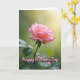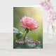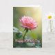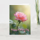 This card features a single light pink flower centered against a softly blurred green background, like a quiet garden moment shared with love ❤️. The many petals open outward with a gentle color shift, from pale blush at the edges to a warmer coral pink near the middle, suggesting a tender, affectionate glow. Several petal tips have a faint deeper pink outline that adds delicate texture, like a subtle blush. A slim green stem and a few leafy shapes sit below the bloom, grounding the scene with a calm, natural balance. In the upper right, a soft golden patch of light warms the background, giving the flower a cozy, caring presence without any harsh contrast. The words “Happy Mother’s Day” appear over the image in flowing lettering, set in a light pink tone that matches the petals, with a small heart nearby 🌼. The text sits toward the upper area of the design, leaving the flower unobstructed and easy to admire, while the heart rests close to the wording as a gentle accent. The petals look slightly translucent where the light hits, and the background fades into smooth emerald greens with a warm glow in the top-right corner.