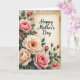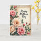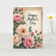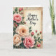 This greeting card features a faux parchment scroll at the center, with softly curled sepia edges that feel like an old love note kept close ❤️. A flowing black cursive message sits prominently on the scroll, taking up most of the middle space and drawing the eye first. Around it, blooming flowers and small buds form a gentle border, as if they’re leaning in toward the message the way close friends might gather around a shared secret 🌼. The blossoms shift through soft pastel tones, including blush pink and creamy apricot, with layered petals that look velvety and carefully shaded. Deep green leaves and stems weave between the flowers, adding contrast and a steady, grounded frame. Behind everything, the background carries faint, faded cursive writing and subtle decorative marks that suggest old correspondence and quiet devotion. Soft, diffused lighting highlights the scroll’s textured surface and the delicate petal edges, with the floral border wrapping around all sides of the centered text in black.