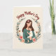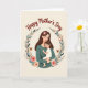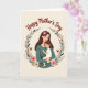 This card shows an adult and a small child wrapped in a close embrace, with the adult’s head tilted gently toward the child as if sharing a quiet, loving moment ❤️. Their figures sit inside a circular wreath of soft green leaves, dotted with tiny flowers that add a tender, garden-like setting. The adult has long dark hair with a few pale pink blossoms tucked in, eyes closed in calm care, while the child’s rosy cheeks and wide eyes face outward with a trusting, relaxed look. One small hand rests on the adult’s chest, a sweet detail that reads like comfort and closeness between them. The background is a warm creamy tone, and the overall colors stay muted with earthy greens, warm browns, and soft floral pinks 🌼. Near the top, the words “Happy Mother’s Day” are placed above the wreath in deep reddish-brown lettering. Small butterflies appear around the leafy circle, adding light motion and a gentle outdoor feel. The wreath is sprinkled with scattered blossoms and simple botanical shapes around the edges.